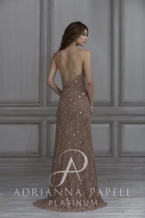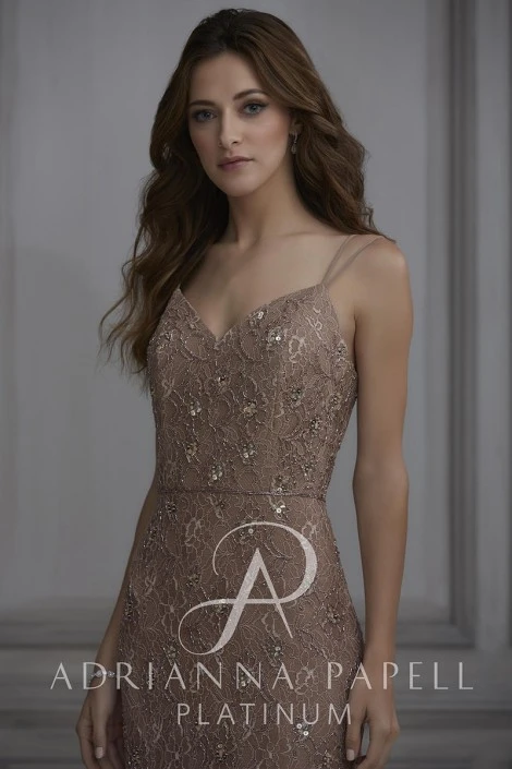 Style 40129 from Adrianna Papell Platinum is a beautiful lace bridesmaid gown that has small clusters of beads and sequins above and below its beaded waistline. The skirt has a font slit and the top has a sweetheart neckline, spaghetti straps, and a beautiful open strappy back.