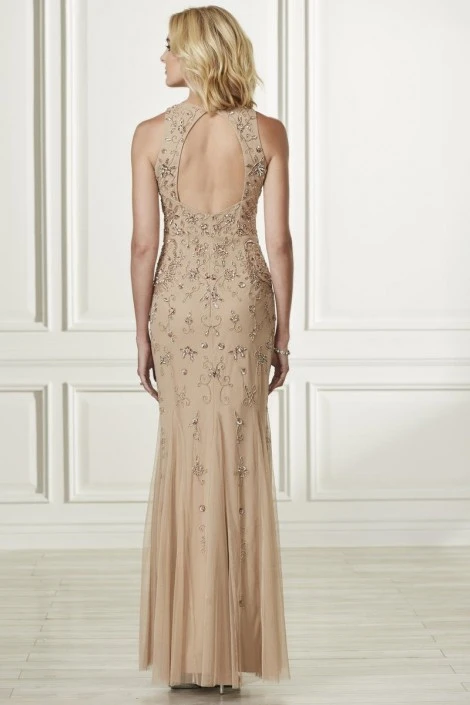 Style 40183 from Adrianna Papell Platinum is an all over beaded bridesmaid gown that has a high neckline on the sleeveless bodice with an open back. The tulle skirt features soft godets.