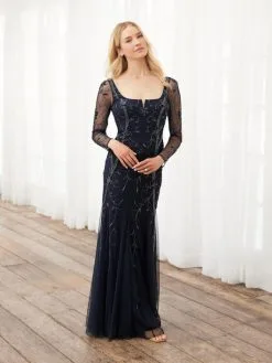 Style 40396 from Adrianna Papell Platinum is on trend today with its notched square neckline and long sheer sleeves. The slim silhouette with soft godets has a floral and vine beaded pattern that creates unspoken beauty.