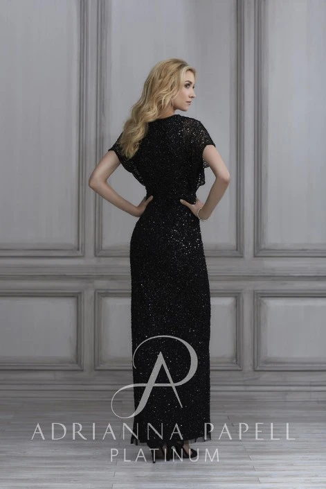 Style 40111 from Adrianna Papell Platinum is an allover beaded tulle bridesmaid gown that has whimsical flutter sleeves, a scoop neckline, a sheath silhouette, and a high side slit.