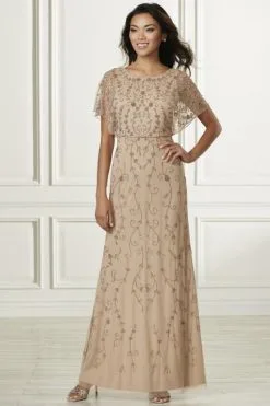 Style 40171 from Adrianna Papell Platinum is an all over beaded tulle bridesmaid gown that has soft sheer flutter sleeves for the perfect amount of coverage. The back neckline dips to a modest V, and the waist has been finished with thin rows of beading.