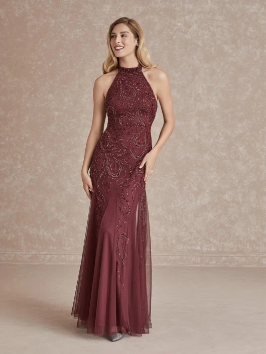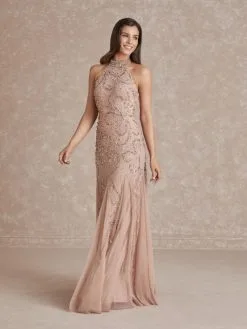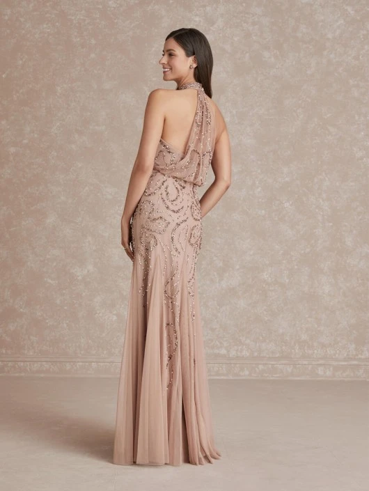 Style 40284 from Adrianna Papell Platinum is a high halter neck slim gown that has an all over beaded large scale floral motif. At the back bodice, the halter neckline leads to a soft blouson racerback detail. The skirt has godets for added soft volume.