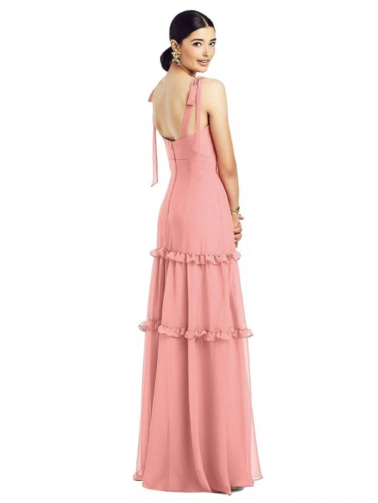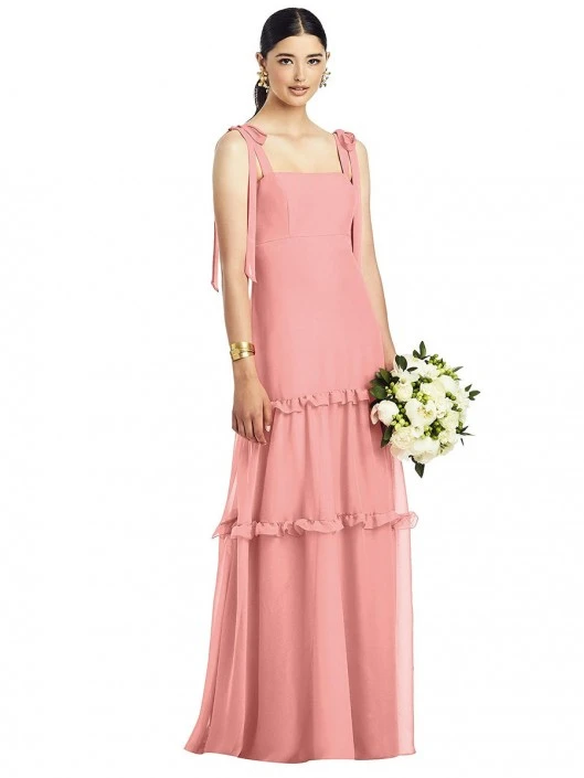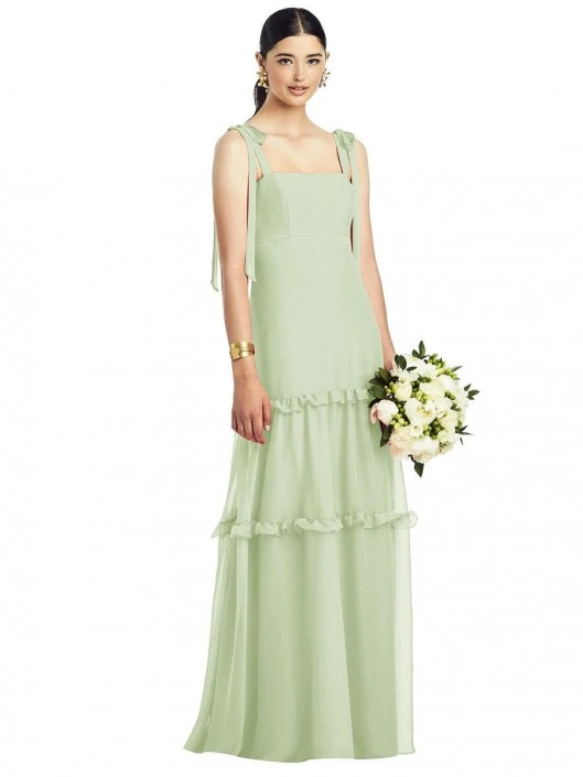 Style 1529 from After Six is a full length crinkle chiffon bridesmaid gown with a tiered ruffle skirt and delicate ruffle detail that has an empire waist and bow straps.
