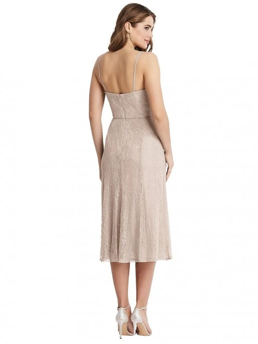 Style 1533 from After Six is a Florentine lace bustier bodice midi bridesmaid dress with adjustable spaghetti straps and a fit and flared skirt that can go from daytime events to any special occasion.