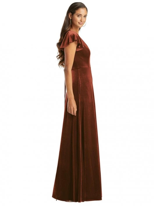 Style 1540 from After Six is a lux velvet V-neck maxi bridesmaid dress with short flutter sleeves and an open V-back a spaghetti tie at the back shoulders. Side pockets are in the full length A-line skirt.
