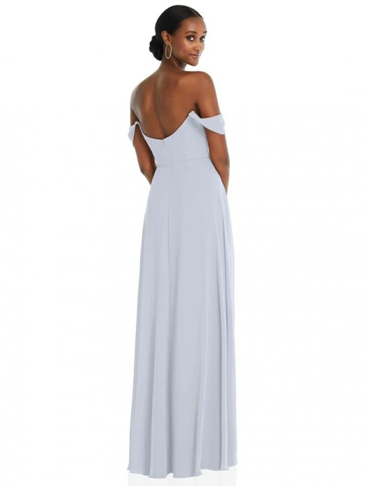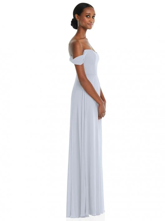 Style 1560 from After Six is a lovely off-the-shoulder lux chiffon maxi dress. The draped flounce sleeves and the elegant basque neckline give this gown a fairy tale touch. The flowy modified circle skirt is paired perfectly with a leg slit.