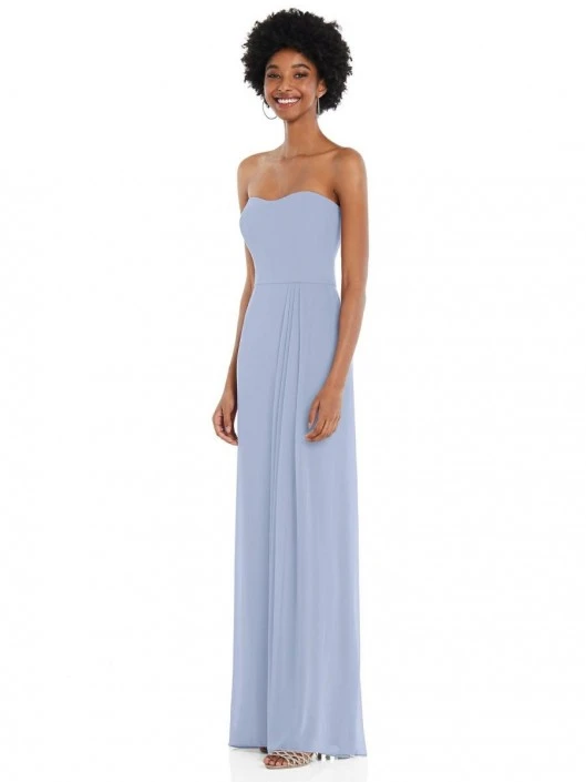 Style 1563 from After Six is a lux chiffon strapless maxi dress. The soft sweetheart neckline and the pleated front slit add the right amount of edge to this classy long dress. The gown features a natural waistline and modified circle skirt that flow together perfectly. The dress also comes with contoured straps if you want to had some extra support.