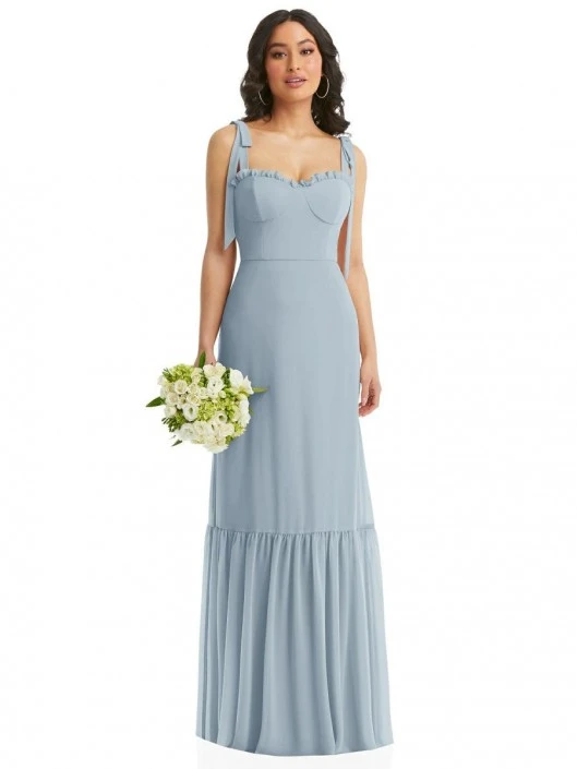 Style 1570 from After Six is a corset bodice lux chiffon maxi dress. The full length A-line skirt has a deep ruffle hem which is absolutely beautiful. The ruffle detail continues on the sweetheart neckline that features a micro-ruffle edge. The tie-shoulders with removable bows add a touch of femininity to the corset bodice. This dress is perfect for bridesmaids as it comes in a variety of colors to match your color scheme.