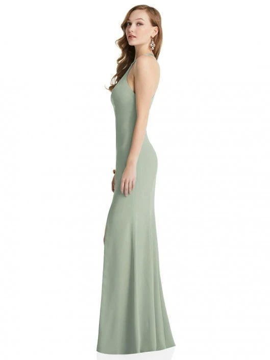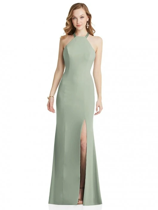 Style 6848 from After Six is a classic crepe maxi dress that has a flirty open back with matching lux charmeuse satin criss-cross straps. It also features a high-neck halter and a gorgeous trumpet skirt with a high slit. Available in solid only.