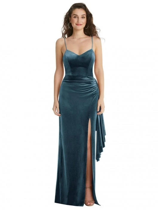 Style 6851 from After Six is a lux velvet maxi dress with spaghetti straps. This dress features a gorgeous draped skirt, a thigh-high slit for a special touch, and a side cascade detail.