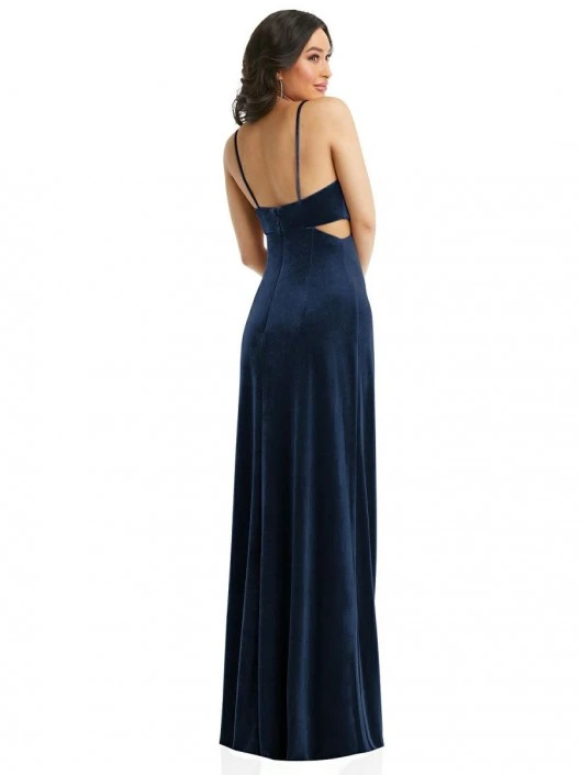 Style 6866 from After Six is a full length lux velvet dress. This gown features narrow straps and side midriff cutouts. The flowy A-line skirt enhances the beautiful silhouette.
