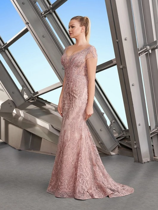 Style 1169 from Alexander by Daymor is a sequin lace fitted gown that has a V-neckline, a scoop back, and sheer short sleeves.
