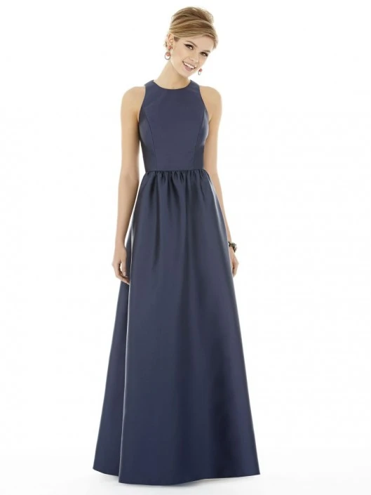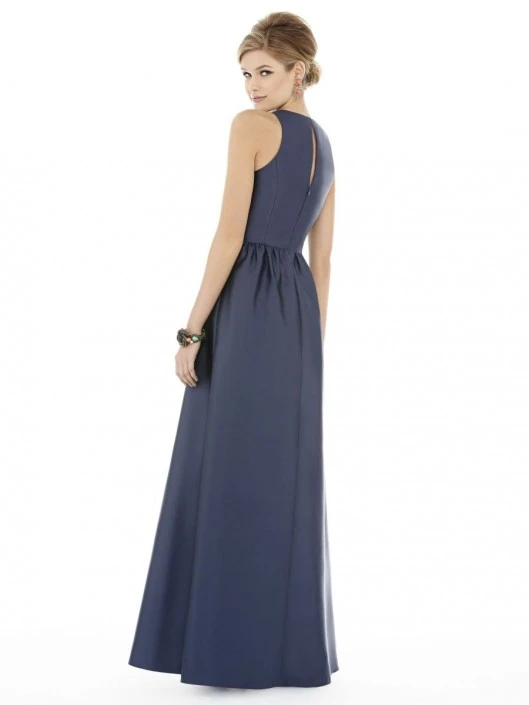 Style D707 from Alfred Sung is a full length sleeveless sateen twill bridesmaid dress with jewel neck and keyhole back. Pockets at side seams of pleated skirt.