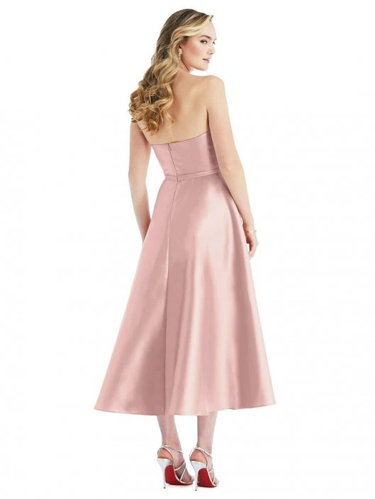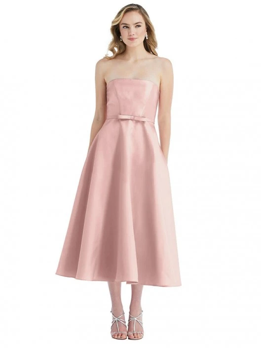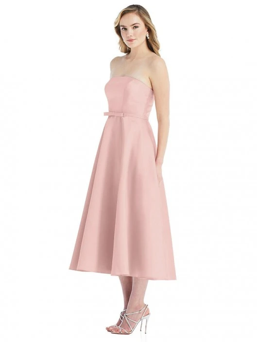 Style D801 from Alfred Sung is a satin twill midi bridesmaid dress that has a strapless straight neckline with a slim flat bow along the natural waist and a full circle skirt that falls to the calves.