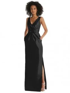 Style D810 from Alfred Sung is a sleeveless satin twill maxi pencil dress with a bow detail at the pleated waist. It has a flattering V-neck front and back, and pockets for convenience.