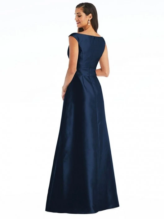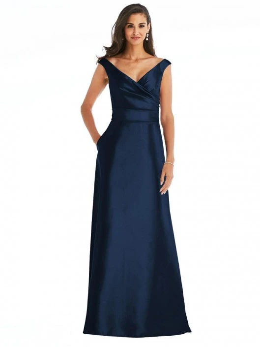 Style D811 from Alfred Sung is a satin twill off-the-shoulder maxi dress. The faux wrap draped bodice is paired with the off the shoulder style to create a romantic silhouette. The modified circle skirt finishes off the dress beautifully with a sewn-in waistband. This dress is available in solid or in any combination of satin twill colors for the dress (primary color) and the waistband (secondary color). The personalization makes this dress perfect for bridesmaids.