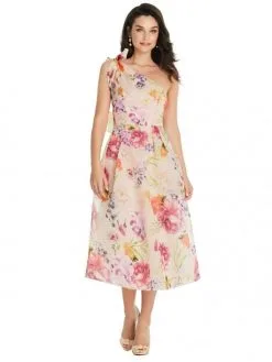 Style D835FP from Alfred Sung is a floral print organdy tea-length midi dress that has bright springtime colors that pop. This dress features a scarf-tie one-shoulder bodice that ties the whole dress together.