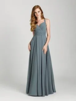 Style 1657 from Allure Bridal is a chiffon A-line bridesmaid gown that has crossover ruching on the sweetheart bodice and a ruched waistband.