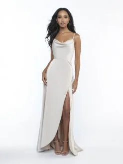 Style 1685 from Allure Bridal has a draped neckline that softens the silhouette of this spaghetti strap stretch satin bridesmaid gown. The open front slit adds to the flattering and flirty style.