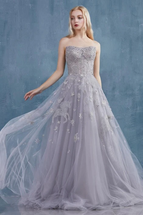 Style A0890 from Andrea and Leo is a strapless constellation dream sweetheart gown with a corset bodice and lace up back.
