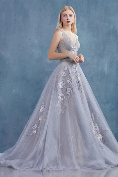 Style A0893 from Andrea and Leo is a Virginia embroidered V-neck ballgown with an illusion scoop back bodice.