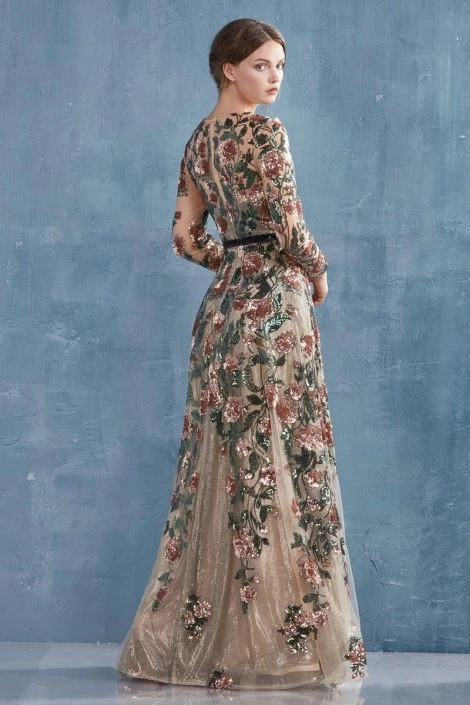 Style A0926 from Andrea and Leo is a long sleeve floral sequined lace A-line gown with illusion.
