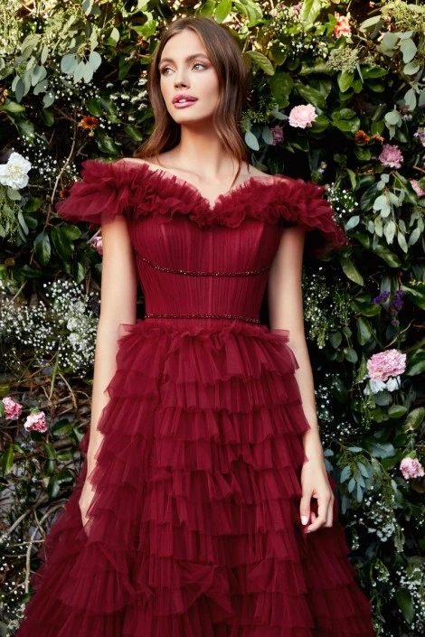 Style A1032 from Andrea & Leo is an off shoulder tulle prom gown with jewel embellished waist. This gown features a ruffle shoulder overlooking a pleated, corset boned bodice. The dramatic tulle skirt with mini ruffle layers softly form an A line shape, complete with an elongating train.