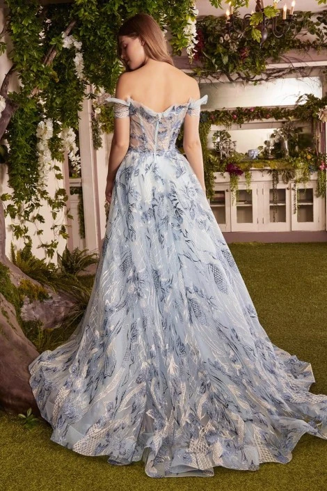 Style A1059 from Andrea & Leo is an off the shoulder Ariel ball gown featuring a ruffle neckline, sheer bodice and shimmering glitter pattern throughout.