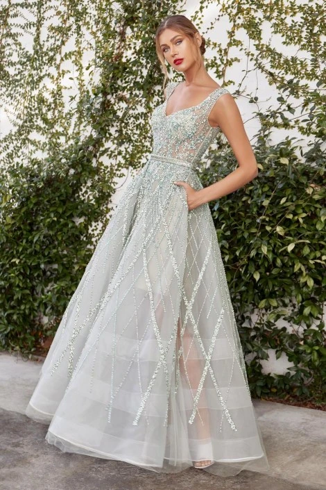 Style A1091 from Andrea & Leo is a Gemma Jewel Beaded Ball Gown with a sleeveless V neck bodice, an A-line skirt, and gorgeous jewel beading on the sheer fabric.