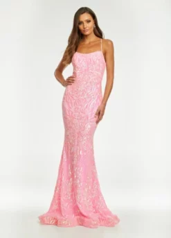 Style 11114 from Ashley Lauren is an exquisite stretch sequin evening gown that has spaghetti straps with a regal lace up back. The stretch sequin fabric will contour your body to provide the perfect silhouette.