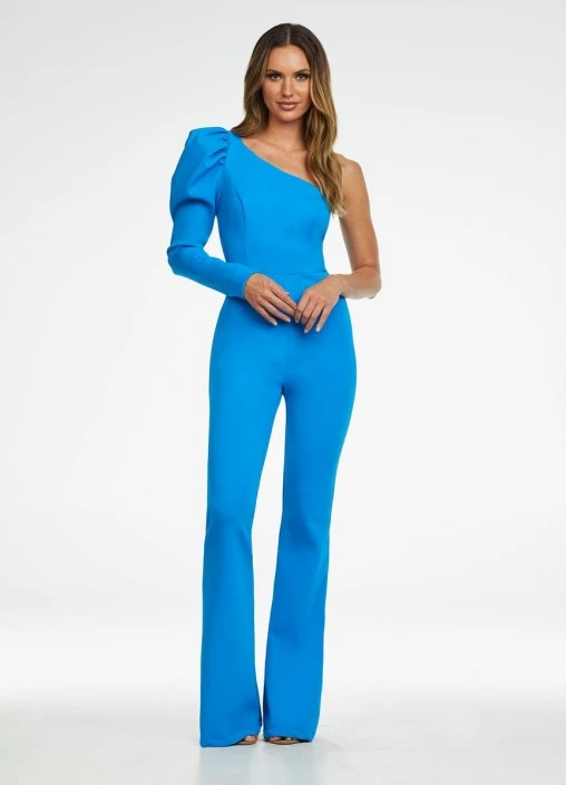 Style 11120 from Ashley Lauren is a chic one shoulder corset fabric jumpsuit accented with one dramatic long puff sleeve.