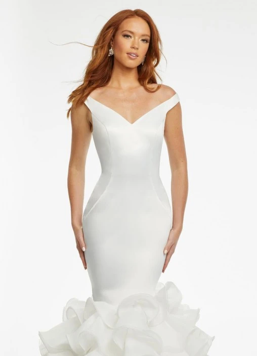 Style 11126 from Ashley Lauren is a dramatic off the shoulder formal gown with contoured seaming that is sure to provide you with the perfect silhouette. The look is completed by a mermaid organza ruffle skirt with long train.