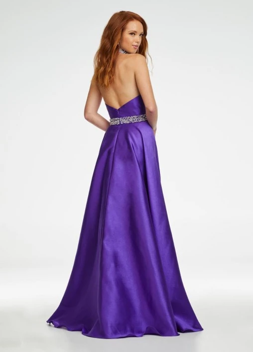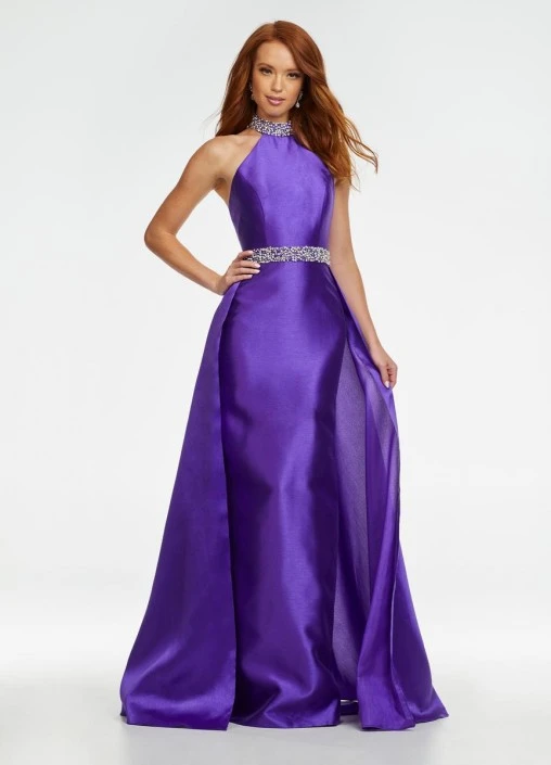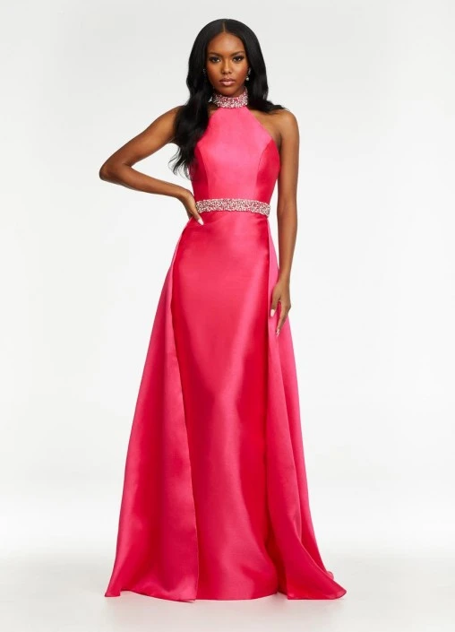 Style 11148 from Ashley Lauren is a high neck Mikado column prom gown accented with a beaded halter neckline and waist. The look is completed with an overskirt.