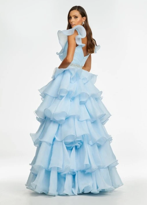Style 11154 from Ashley Lauren is a dreamy organza ball gown accented with a V-neckline and shoulder ruffles cascading down to the waistline which is embellished with crystal and pearl detailing. The look is finished with a tiered ruffle skirt.