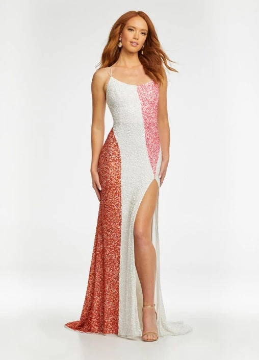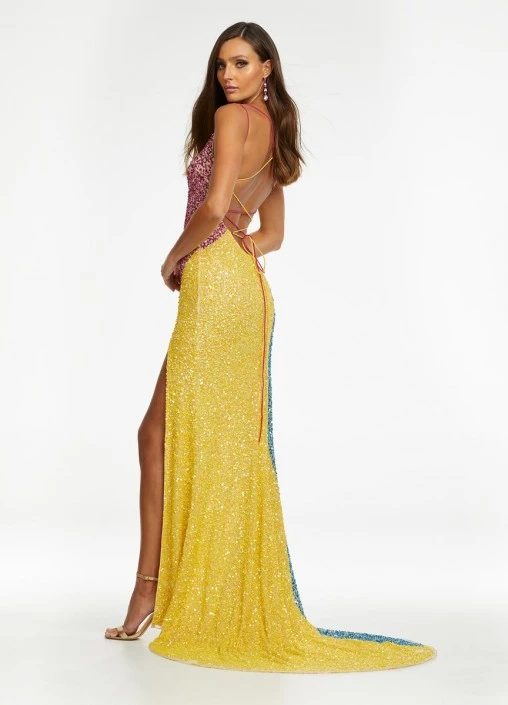 Style 11160 from Ashley Lauren is a unique and funky prom gown sure to turn heads at your next event. This sequin gown with spaghetti straps is accented with color blocking detail. The look is completed with a slit and two tone lace up strappy low open back.