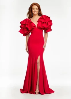 Style 11171 from Ashley Lauren is a glamourous scuba evening gown featuring a V-neckline and multi tiered shoulder ruffles. The contour seaming is sure to accentuate your curves. The look is completed with a skirt slit and open V back.