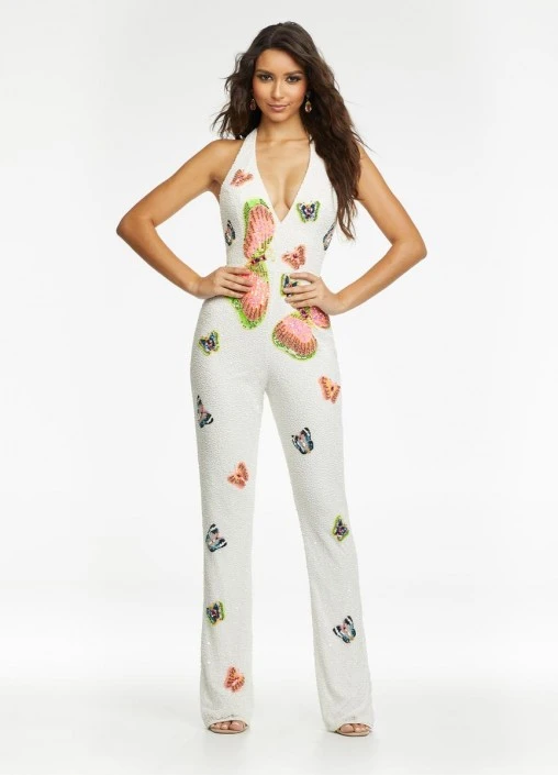 Style 11179 from Ashley Lauren is a beautiful beaded jumpsuit with a deep V halter neckline giving way to intricately beaded butterflies scattered throughout. The look is completed with flare pant legs and an open back.
