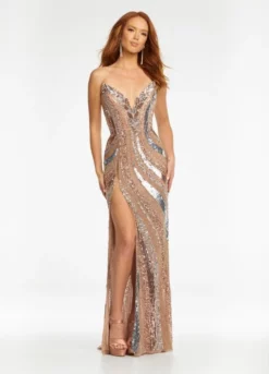Style 11180 from Ashley Lauren is a strapless plunging V-neck couture gown completed with an intricate bead pattern throughout. The high right slit is sure to turn heads.