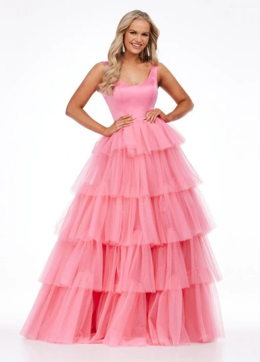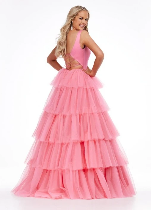 Style 11187 from Ashley Lauren is a sassy and fun scoop neck ball gown that has a satin bustier giving way to a tulle multi tiered ruffle skirt. The look is accented by an open lace up back that is sure to give you the perfect fit.