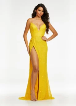 Style 11188 from Ashley Lauren is a strapless beaded formal gown featuring a plunging neckline. The bustier will hug your body with the built in corset. The look is finished off with a V-back and a high skirt slit.