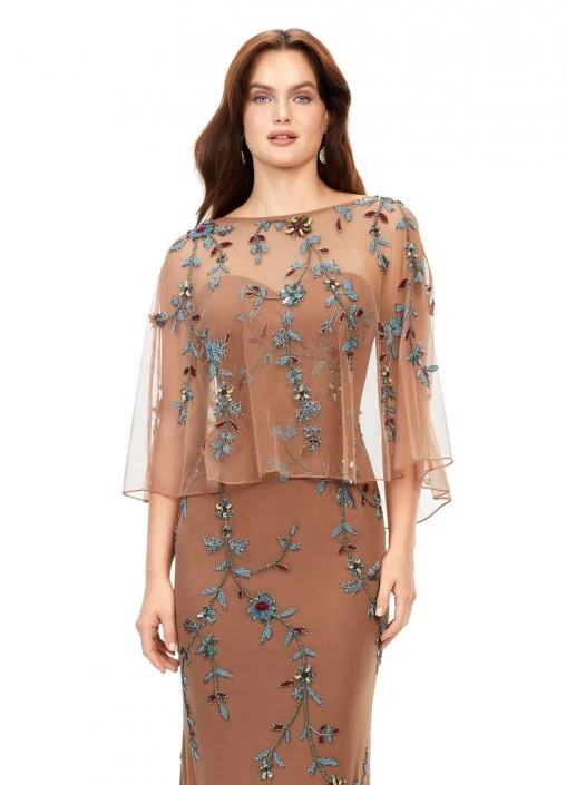 Style 11211 from Ashley Lauren is a sophisticated evening gown. This strapless beaded gown is paired with a light sheer detachable overlay. The gown and overlay are adorned with a floral beaded motif.