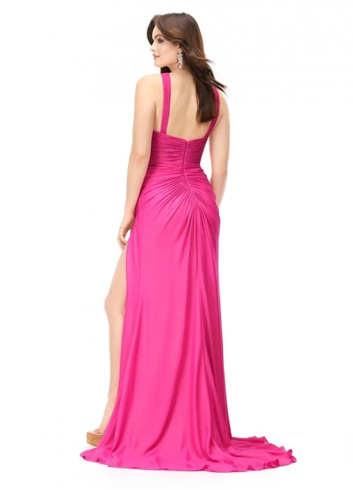 Style 11252 from Ashley Lauren is a chiffon prom gown that features a criss cross halter neckline with keyhole, ruching and an open back. The wrap skirt gives way to a high left leg slit and sweep train.