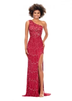 Style 11284 from Ashley Lauren is a one shoulder beaded prom gown with a peacock inspired beaded pattern that is sure to turn heads. The look is complete with a sweep train, asymmetrical lace up back and high skirt slit.