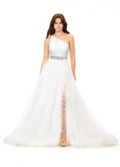 Style 11309 from Ashley Lauren is a one shoulder organza ball gown that features a ruched bodice giving way to a crystal encrusted waistband. The full A-line skirt is accented with a left leg slit and trimmed in feathers that will glide across the floor. The look is complete with a gorgeous train!