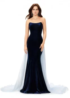 Style 11311 from Ashley Lauren is a stunning velvet formal gown that features a strapless sweetheart neckline with a sheer organza back overskirt. The overskirt is embellished with scattered crystals that cascade down the skirt.