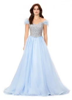Style 11314 from Ashley Lauren is an off the shoulder pageant gown with feather details on the draped sleeves. The crystal encrusted sweetheart bodice is sure to sparkle. The organza A-line skirt with wire hem will glide across the floor at your next event.