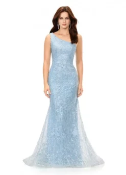 Style 11334 from Ashley Lauren is a glamorous one shoulder sequin prom gown. The bodice is embellished with lace appliques that cascade down onto the fitted skirt. The look is complete with a full zipper back.