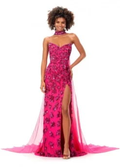 Style 11351 from Ashley Lauren is a strapless beaded pageant gown with crystal detailing that is sure to make a statement at your next event. The sweetheart neck gown features a gorgeous beaded neck choker with an attached long sheer chiffon cape.