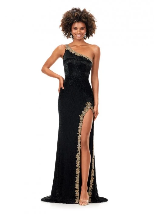 Style 11352 from Ashley Lauren is a liquid beaded formal gown that features a one shoulder neckline and a high left leg slit, both edged with crystal trim. The look is complete with a sweep train.
