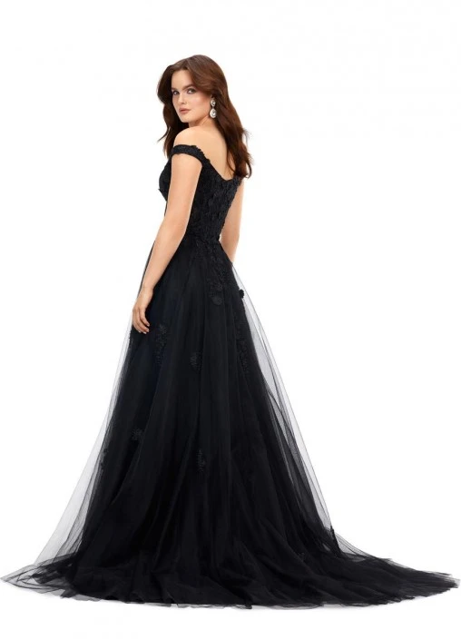 Style 11376 from Ashley Lauren is an off the shoulder fairytale dream gown that features an illusion corset and 3-dimensional lace flower appliques throughout layers of tulle. The look is complete with a high left leg slit on the A-line skirt.